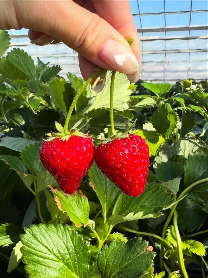 いちごのアップ写真も投稿されており、艶やかな赤色の果実の表面には小さな種が点在し、白いハートのデザインが施されたネイルの指先で茎をつまむ様子が写っています。また、棚からいくつものいちごが垂れ下がる温室内の景観も収められており、鮮やかな赤と深い緑のコントラストが印象的です。