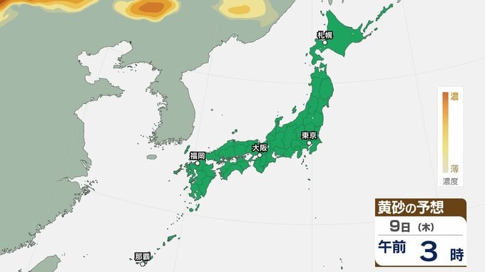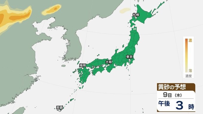 【黄砂情報】九州・中国・四国の西日本の広い範囲で影響の可能性 日本列島に黄砂が飛来か…6日(月)~9日(木)黄砂シミュレーション【気象庁 6日現在】 RSK山陽放送 2026年4月6日(月) 08:00 国内 天気 9日(木) ▶6日(月)~9日(木)黄砂シミュレーション画像 ▶6日(月)~9日(木)黄砂シミュレーション画像 飛来が予測されるエリアでは、洗濯物などを屋外で干す際は注意が必要です。また目、鼻、皮膚などに関するアレルギー体質の方や、喘息など呼吸器に疾患がある方は、十分に注意してください。