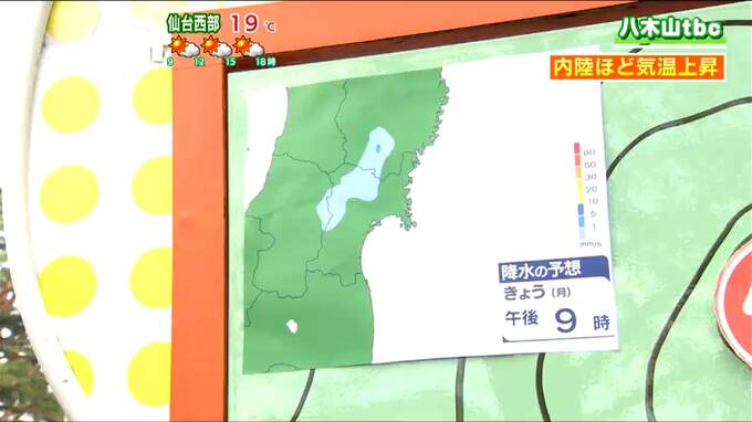 夜9時ごろには、県の北部や西部を中心に所々で雨が降る可能性があります。雨が特段強まることはない見込みですが、夜遅くに帰宅される方は念のため折りたたみ傘をお持ちになることをおすすめします。