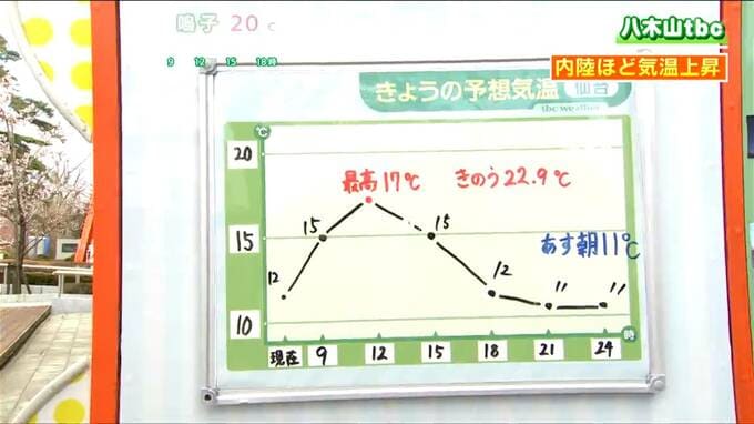 6日の気温は昨日(日曜日)ほどではないものの、内陸部を中心に高くなる見込みです。仙台の最高気温は17℃の予想で、沿岸の地域では昨日より5〜6℃低くなるところが多い見込みです。一方、内陸の白石では20℃前後まで上昇するおそれがあります。