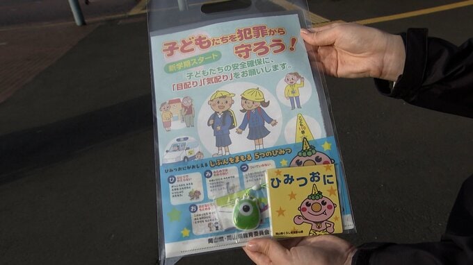 新学期のスタートに合わせて、子どもたちを犯罪から守る意識を高めてもらおうと、岡山県が学生ボランティアなどと共に行ったものです。子どもたちが事件や事故に巻き込まれないよう、地域全体での大人による見守りや、声掛けを促すチラシなどを配り、協力を呼びかけました。