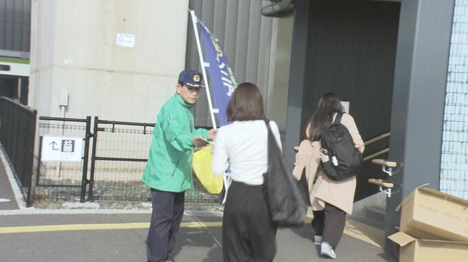 6日はJR岩手飯岡駅前に、警察官や盛岡市の交通指導隊員など合わせておよそ30人が集まり、駅を利用する歩行者や自転車に乗る人たちにチラシなどを配って、事故防止を呼びかけました。