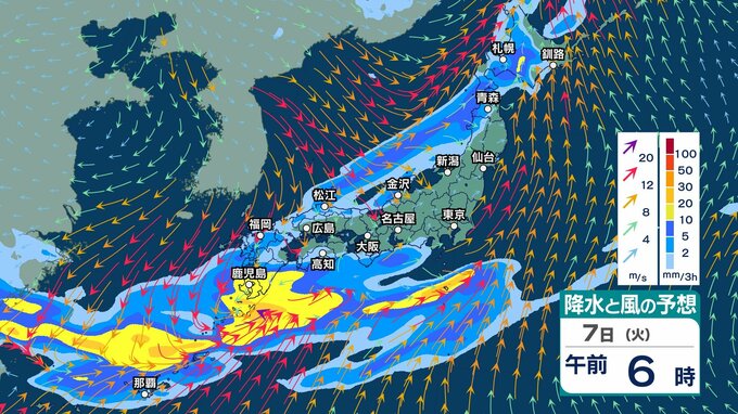 あす7日午前6時までに予想される24時間降水量は九州南部・奄美で120ミリとなっていて、まとまった雨が予想されています。