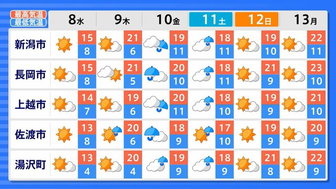 ▼阿賀町津川 14℃/8℃ ▼湯沢町 13℃/9℃