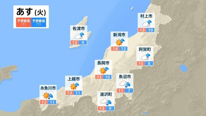 ▼上越市高田 14℃/10℃ ▼佐渡市相川 11℃/9℃