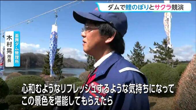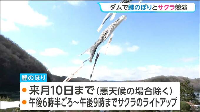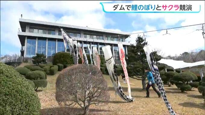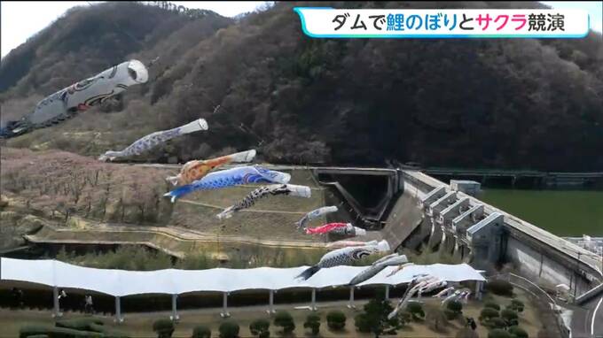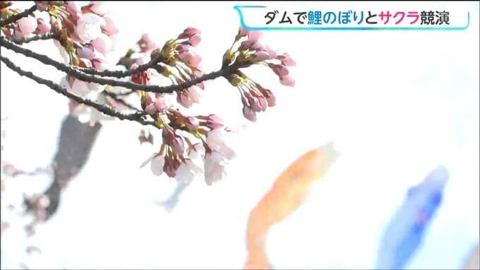 本格的な春の観光シーズンを前に、宮城県川崎町の釜房ダムでは、6日から鯉のぼりが掲げられています。周辺では、サクラが咲き始めていて、鯉のぼりとの競演を楽しむことができます。