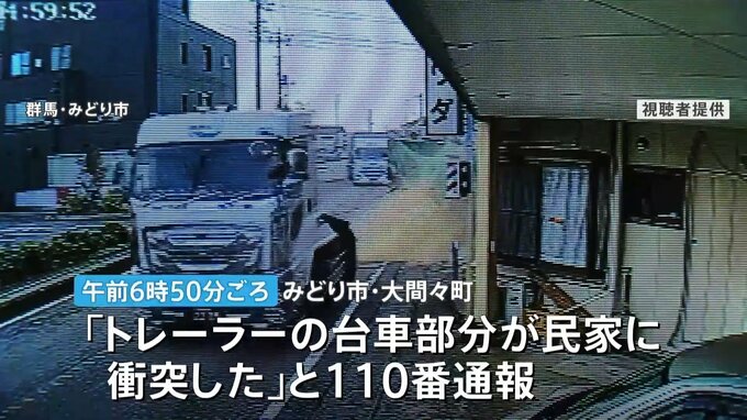 きょう午前6時50分ごろ、みどり市・大間々町で「トレーラーの台車部分が民家に衝突した」とトレーラーの男性運転手から110番通報がありました。