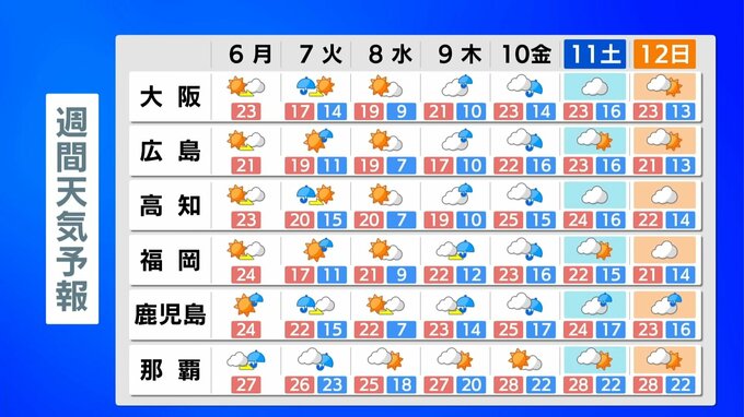 あす、通勤通学の時間帯は関東から九州の太平洋側を中心に雨が降り、北海道や東北北部も雨の所がありそうです。西日本の雨は午前が中心で、午後は東日本や北日本も次第に雨は止みますが、関東は夜まで雨の残る所があるでしょう。また、雨とともにあす午後からは寒気が流れ込み、暑かったきょうに比べると急に気温が下がります。西日本では北風も強まるでしょう。水曜日の朝は一桁の気温になる所が多く、冷え込みそうです。服装の調節や体調管理にお気をつけください。寒気の南下は一時的で、週後半は再び暑さが戻りそうです。