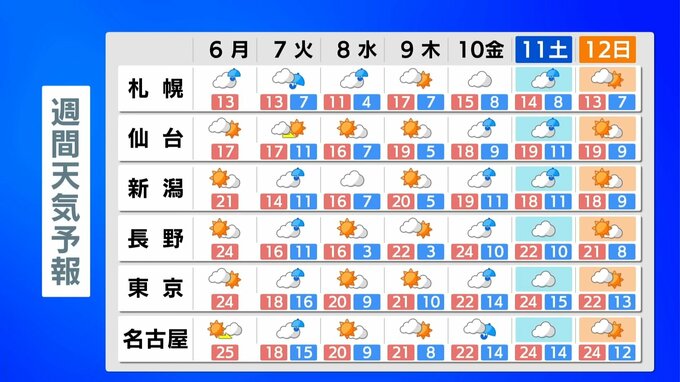 きょうは全国的に晴れますが、天気はゆっくりと下り坂です。九州と北海道は夕方から夜に雨の降りだす所がありそうです。東北から中国、四国は次第に雲が広がりますが、大きな天気の崩れはないでしょう。きょうは日差しと暖気の影響で、午前中から気温が上がっていて、東京はすでに今年一番の暑さを更新しています。名古屋は日中25℃まで上がる予想で、今年初の夏日になるでしょう。そのほか、さいたま、甲府、浜松(静岡)、福井、人吉(熊本)でも25℃の夏日になりそうです。
