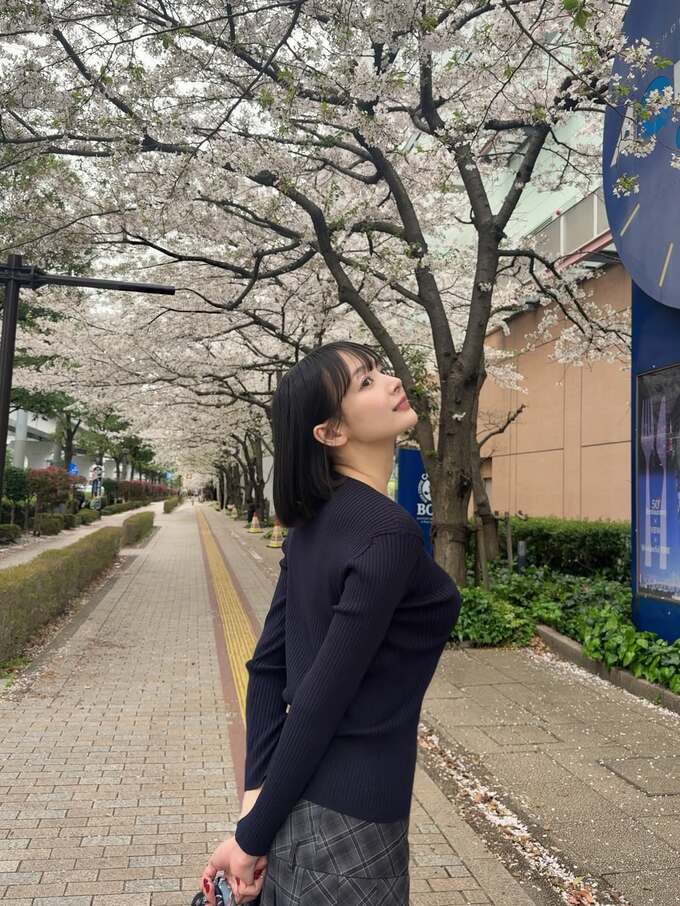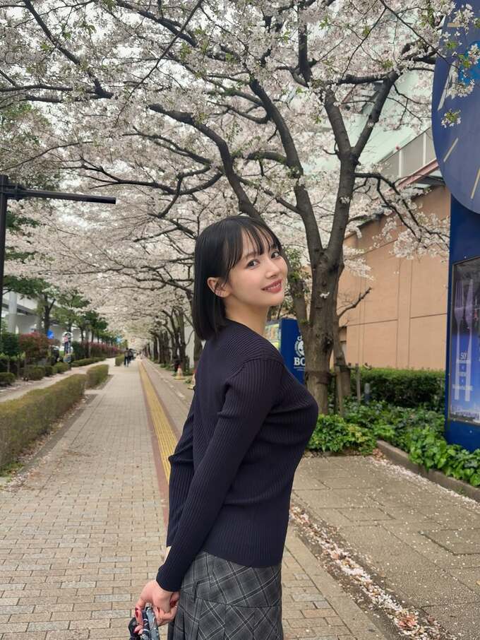コーディネートは濃紺のニットに格子柄のスカートというシンプルながらも洗練されたスタイル。黒髪と淡い桜色のコントラストが視覚的な美しさを際立たせています。地面には花びらが散り、歩道の黄色い誘導ブロックが続く道の奥まで、春の情景が広がっています。やさしい日差しの中、その笑顔もどこかほんわかと温かく映ります。