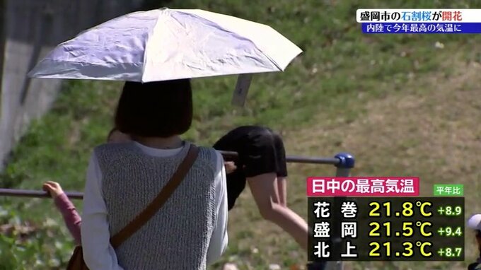 日中の最高気温は最も高かった花巻で21.8度、盛岡で21.5度、北上で21.3度などと、34観測地点のうち20地点で2026年最高を記録しました。