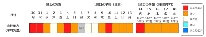北陸地方の向こう2週間の気温は、暖かい空気が流れ込みやすいため高い日が多く、10日頃からはかなり高くなるでしょう。