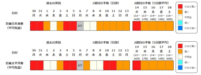 近畿地方の向こう2週間の気温は、暖かい空気が流れ込みやすいため高い日が多く、かなり高い日もあるでしょう。