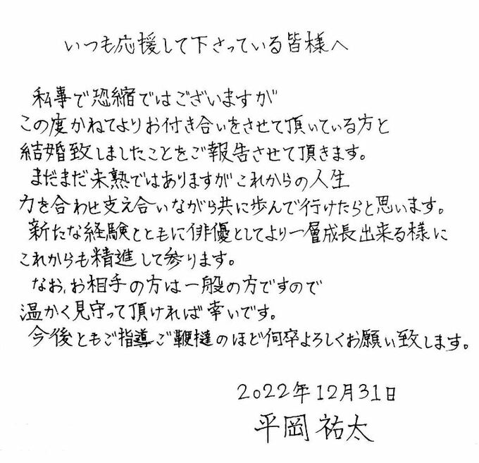 平岡さんは手書きのメッセージを添え「まだまだ未熟ではありますがこれからの人生 力を合わせ支え合いながら共に歩んで行けたらと思います」と、その想いを綴っています。