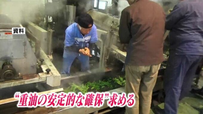 荒茶の生産量が2年連続日本一になり農家の意欲が高くなる一方、懸念されるはここでも中東情勢です。茶を蒸す過程で必要な蒸気をつくる重油の安定的な確保を求める声が聞かれました。