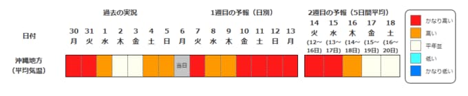 沖縄地方の向こう2週間の気温は、暖かい空気が流れ込みやすいため高い日が多く、10日頃からはかなり高くなる見込みです。