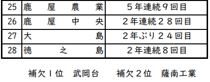 【出場校一覧】鹿児島県選抜高校野球大会 出場28校が決定【夏の前哨戦】2026 南日本放送 2026年4月6日(月) 16:08 国内 ・鹿屋農業(5年連続9回目) ・鹿屋中央(2年連続28回目) ・大島(2年ぶり24回目) ・徳之島(2年連続8回目) 補欠校は1位が武岡台、2位が薩南工業となっています。