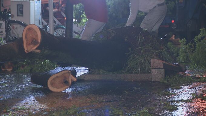 中土木事務所によりますと、4日午後7時半ごろ、中区栄3丁目の松坂屋名古屋店の東側で、約30年前に植えられた高さ約15メートルの「けやき」が、根元から倒れました。倒木によるけが人はいませんでした。