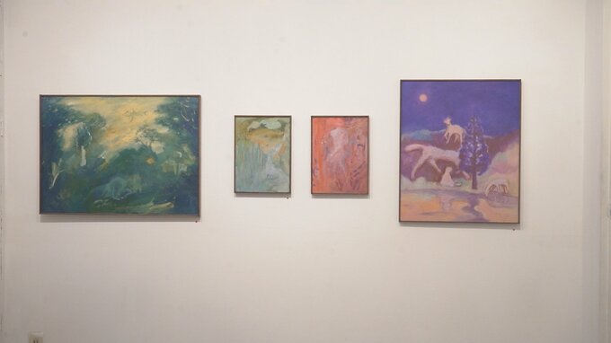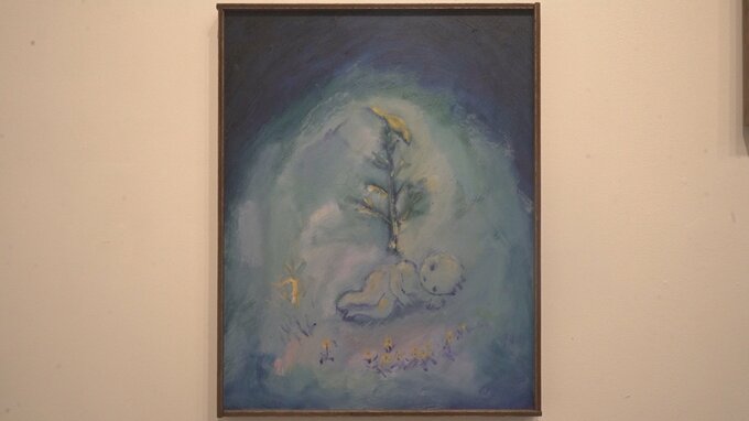 メインのギャラリーとバーとの接続部にかかっていた、月夜の森で子どもと動物が佇んでいる絵がひときわ印象に残った。