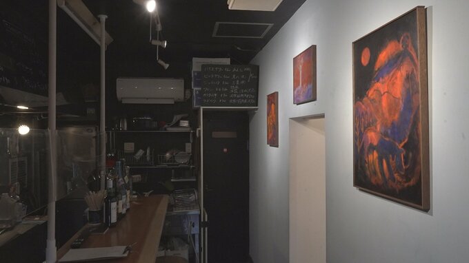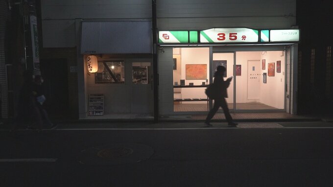 新井薬師駅前の、まさに典型的な”日本の商店街”を歩いていると不意打ちを喰らわせるかのように現れるのが「ギャラリー35分」。写真家の酒航太(さけ・こうた)さんが運営するこの小さなギャラリーが元はDPE店だったことはその外観から一目瞭然だ。隣のバーとつながっていて、そちらにもまるでギャラリーがはみ出したかのように絵が飾ってある。