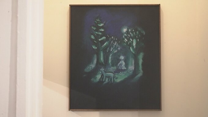 隣町珈琲での集いが終わって片づけに入った頃、入江さんは阿部さんが個展から持ってきた絵の中から一つを選んで買った。「絵を買ったりすると、”マダム気取りか”とか言う人もいるので・・・」と気にしてはいたものの、とても気に入った様子だった。それは私もギャラリーで見た、月夜の森で、子どもと動物が佇む絵だった。