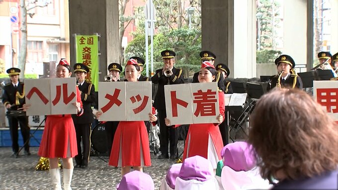 出発式には、警察や交通安全協会などから約100人が参加しました。今月(4月)1日に制度が改正された自転車の交通ルールの徹底のほか、子どもをはじめとする歩行者の安全確保などに重点を置き、各地で啓発活動や取り締まりが実施されます。
