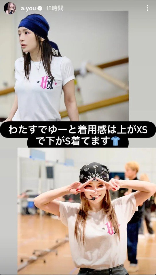 また、続く投稿で、浜崎あゆみさんは「ayumi hamasaki × MFC STORE POP-UP STORE」の商品を紹介すると、「わたすでゆーと着用感は上がXS で下がS着てます」とTシャツを着用した画像を添えて説明。