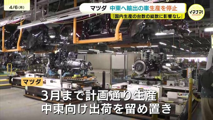 イラン情勢を巡る広島企業への影響についてです。マツダは、中東に向けて輸出している車の生産を一旦停止したことを明らかにしました。