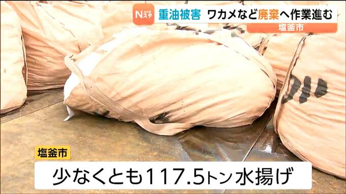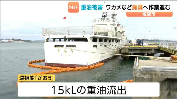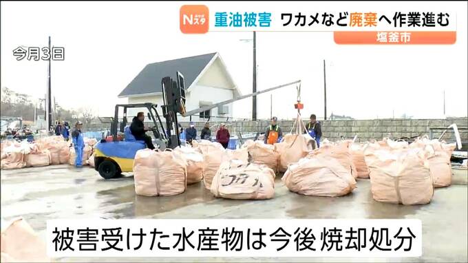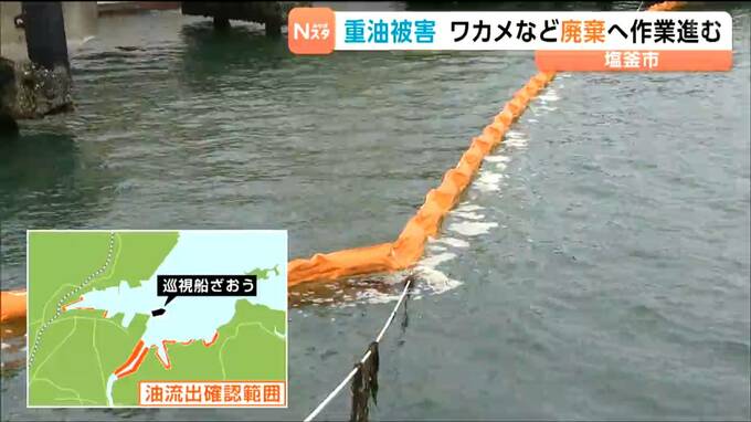 宮城県の塩釜港で宮城海上保安部の巡視船から重油が漏れ出した問題で、塩釜市では、ワカメやメカブを仮置き場に集め廃棄に向けた作業が進んでいます。