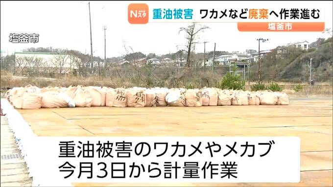 塩釜市内の漁港では、重油の被害を受けたワカメやメカブの水揚げと計量作業が、4月3日から始まっています。