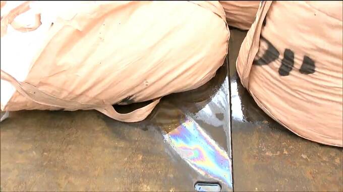 「廃棄予定のワカメやメカブが入った袋が並んでいます。そして、付着した重油が袋から染み出しています」