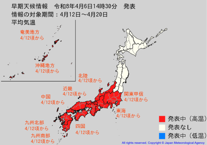 6日に気象庁が発表したのは、「高温に関する早期天候情報」で、内容は「4月12日ごろから、関東地方や東海地方、近畿地方などでは、この時期としてはかなりの高温になる可能性がある」というものです。