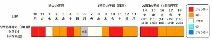 九州北部地方(山口県を含む)の向こう2週間の気温は、暖かい空気が流れ込みやすいため高い日が多く、かなり高い日もあるでしょう。農作物の管理等に注意してください。また、今後の気象情報等に留意してください。
