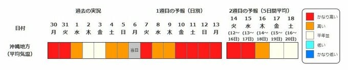 沖縄地方の向こう2週間の気温は、暖かい空気が流れ込みやすいため高い日が多く、10日頃からはかなり高くなる見込みです。農作物の管理等に注意してください。また、今後の気象情報等に留意してください。