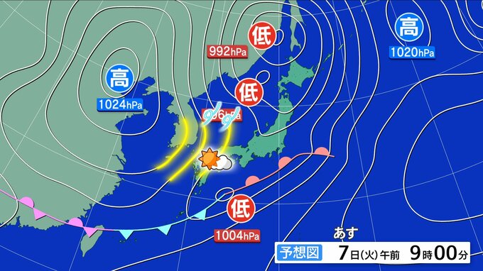 気圧の谷が通過し、あす明け方から朝にかけて雨が降る見込みです。通勤通学時間帯は雨が降っている所が多いでしょう。ただ、天気の崩れは一時的で午前中から日差しが届く予想です。等圧線の間隔が狭く、強風に注意が必要です。日差しが届いても北風が冷たい一日になりそうです。また、空気の乾燥が進むため、火の取り扱いにはご注意ください。