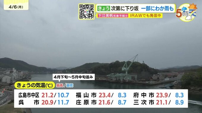 きょう6日(月)の広島県内は、昼過ぎまで日差しがよく届き気温が上昇しました。最高気温は、広島市中区で21.2℃ 府中市では23.9℃まで上がりました。各地4月下旬から5月中旬並となっています。