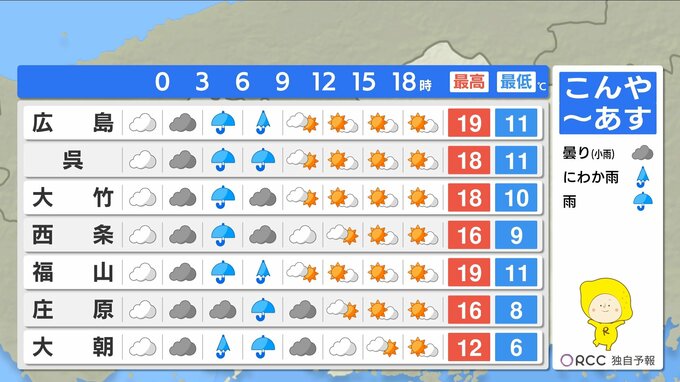 【あす4/7(火)広島天気 】明け方から朝まで雨 本降りの時間帯も 日中晴れても北風ひんやり冷たい 強風に注意 中国放送 2026年4月6日(月) 19:43 国内 天気 北風ひんやり 上着必要 日中の気温は各地で20℃を下回り、北風がひんやり感じられるでしょう。北部や内陸部では最高気温が15℃前後の予想で、かなり肌寒く感じられそうです。昼間も上着が必要になるでしょう。
