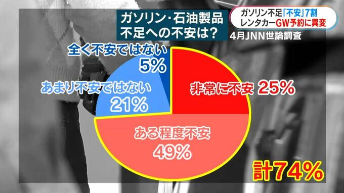 イラン情勢の緊迫化などを受け、不安定な動きが続く、ガソリン価格。JNNが行った調査によりますと、国内でガソリンや石油製品などが「不足するのではないか」と不安に感じている人は、全体の74%にのぼっています。