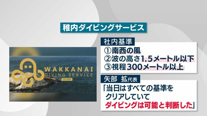(1)南西の風(2)波の高さ1.5メートル以下(3)視程300メートル以上という判断基準を設けていて、HBCの取材に、矢部拡代表は「当日はすべて基準をクリアしていて、ダイビングは可能と判断した」と説明しています。