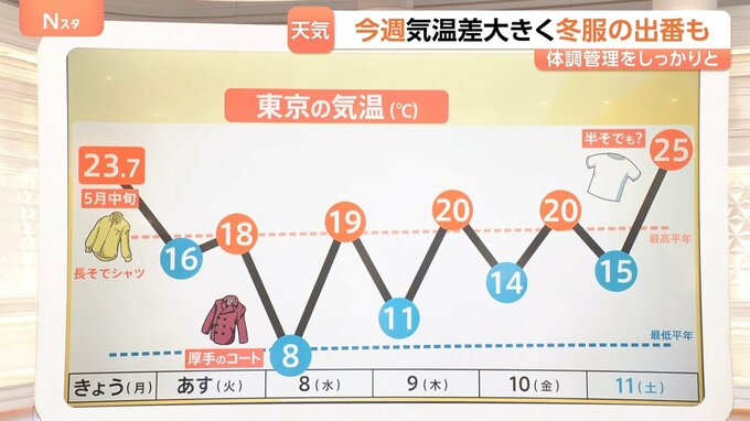 週末はまた気温が上がり、土曜(11日)の予想最高気温は25℃のため、半袖も必要となってくるかもしれません。この1週間は全ての季節の服装が必要となりそうです。