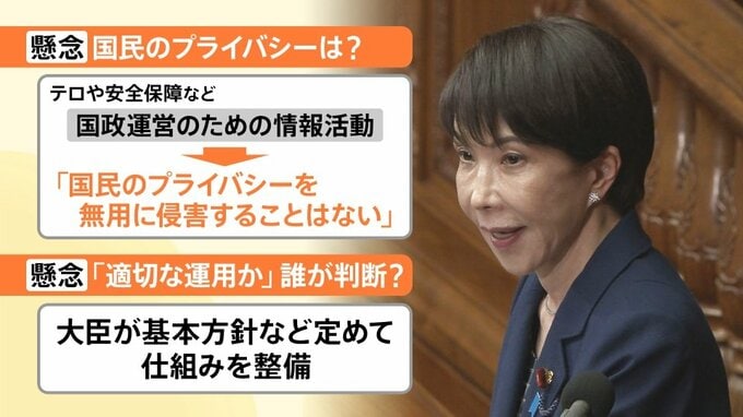 高市総理は、「行うのは安全保障やテロなど、国政運営に資する情報活動であり、このような観点に基づかない指示は行わないので、プライバシーを無用に侵害することはない」と答弁で説明しています。