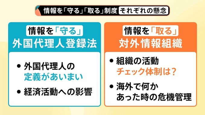 外国代理人登録法、そして対外情報組織の設置にも、それぞれ懸念点はあります。