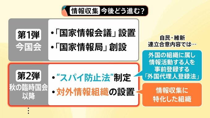第2弾として、秋の臨時国会以降で高市総理が目指すのが、いわゆる“スパイ防止法”の制定と、対外情報組織の設置です。