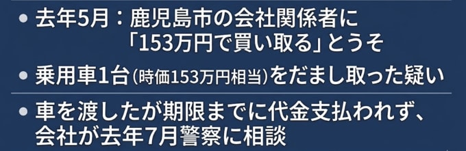 霧島警察署によりますと、福留容疑者は去年5月中旬、車を売却しようとしていた鹿児島市の会社関係者に「153万円で買い取ります」などとうそをつき、この会社が所有する乗用車1台時価153万円相当をだまし取った疑いが持たれています。