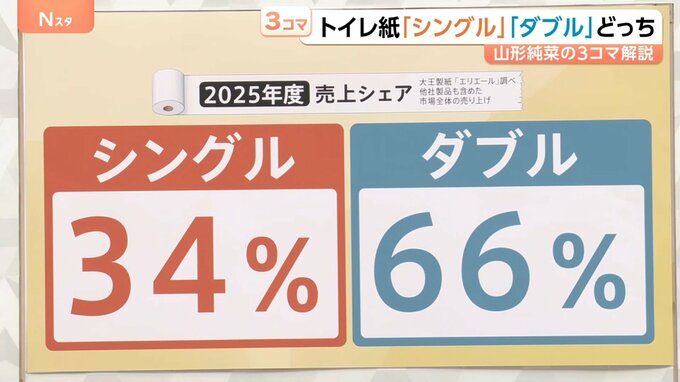 それぞれの2025年度の売上シェアを見てみると、シングルが34%ダブルが66%という結果になりました。(※大王製紙「エリエール」調べ 他社製品も含めた市場全体の売り上げ)
