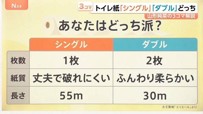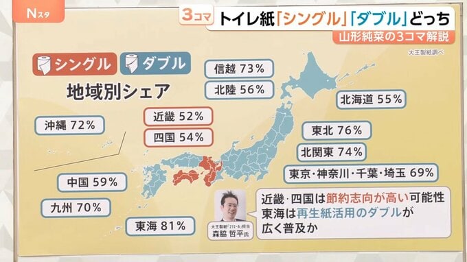 調査を行った大王製紙「エリエール」担当の森脇哲平さんによると、「近畿・四国は節約志向が高い可能性がある。東海地方は再生紙を活用したダブルが広く普及している。再生紙は少しゴワゴワした紙質なので、シングルよりもダブル向きということも影響しているのではないか」ということです。