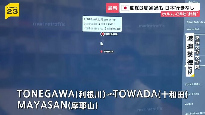「ペルシャ湾内で確認できるのはこの3隻。上から、TONEGAWA(利根川)・TOWADA(十和田)・MAYASAN(摩耶山)。MAYASAN(摩耶山)は日本行きです」