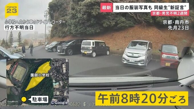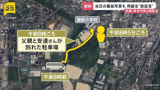 さらにnews23が入手したドライブレコーダーの映像。当日朝、保護者が学校に向かう様子です。到着したのは、この位置にある駐車場。時間は、安達さんが送り届けられたおよそ20分後の午前8時20分ごろです。前には小学校の方に歩いていく卒業生や保護者の姿が映っています。