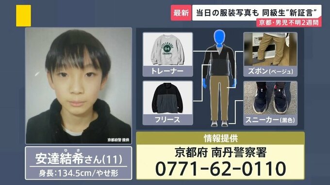 安達さんは、身長13.5センチのやせ型で、胸に「84」と書かれた灰色のトレーナーやベージュのズボン、黒色のスニーカーなどを着用していたということで、警察は情報提供を求めています。