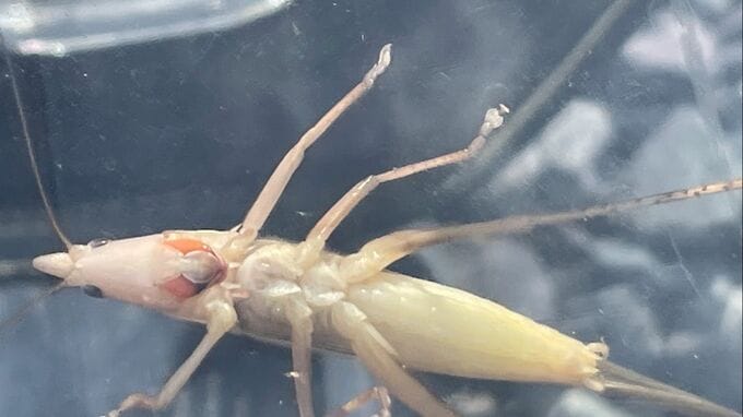 この白っぽいバッタのような生き物は、クビキリギスという物騒な名前なのだそうです。どうしてそんな名前に?